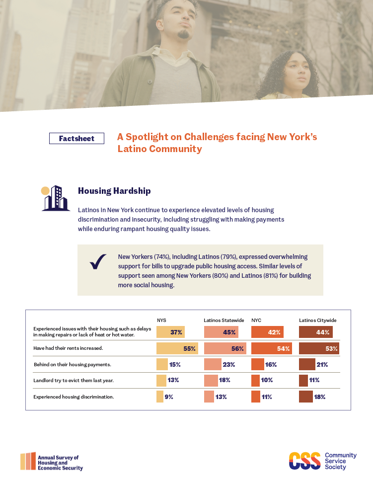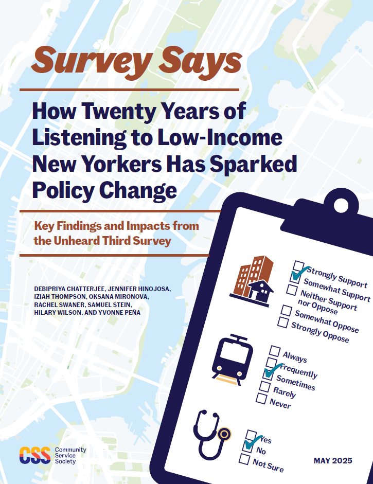 Since 2002, the Community Service Society has sought to better understand the views and experiences of low-income New Yorkers through a groundbreaking public opinion survey, "The Unheard Third." We use the insights gleaned from our annual survey to elevate the concerns of low-income New Yorkers in the public policy debate and to better inform our services and advocacy agenda.